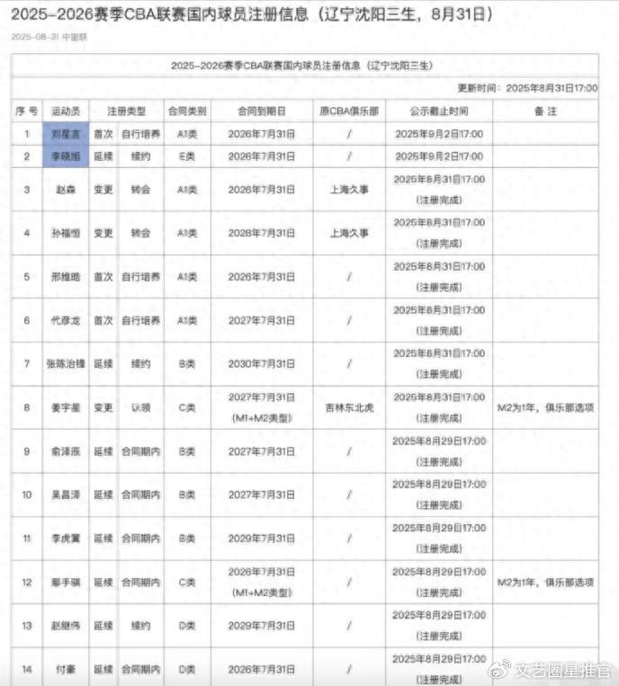 张镇麟去了上海男篮,赵率舟和刘雁宇去了吉林男篮,韩德君选择了退役。辽宁男篮官宣了新赛季本土14人大名单,分别是赵继伟、付豪、李晓旭、姜宇星、鄢手骐、吴昌泽、俞泽辰、李虎翼、张陈治锋、刘星言、赵森、孙福恒、邢维皓、代彦龙;再加上王岚嵚,因为王岚嵚是租借,注册在南京同曦俱乐部的名单上。辽宁每场比赛我都看,这份大名单我都有很多球员不认识,而且只注册了14名球员,一旦球队有几名球员受伤,是不是12人都不够?原来鄢手骐、吴昌泽、俞泽辰、李虎翼机会都不多,新赛季可能都要打主力了。这样一套阵容,辽宁男篮只能把季后赛作为目标了。