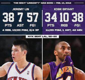 依然是2天之后,面对科比领衔的湖人,林书豪将再次的神奇表演推向高潮,他全场轰下38分,压制科比的同时,帮助球队拿下4连胜。这场比赛赛后,当科比被问到是否注意到林书豪时,他留下了那句经典的“他都拿了38分,你还要我怎么回答”?在那场比赛的最后阶段,科比本想亲自领防林书豪,但即便如此,他依旧无法阻挡林疯狂前进。