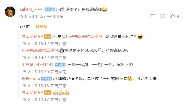 有球迷提及广东队去年将周琦交易至北京队的转会费“不止5000万”,付政浩回应称:“5000W未免太低估这笔交易了。”