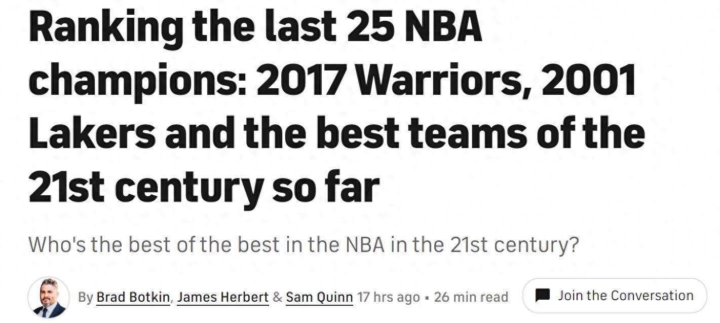 宇宙勇前三独占两席!在又一个赛季结束距离新赛季还剩一个多月的情况下,美媒《cbs sports》适时评选出21世纪最佳冠军球队,其中20年园区夺冠的湖人队仅排第20名。